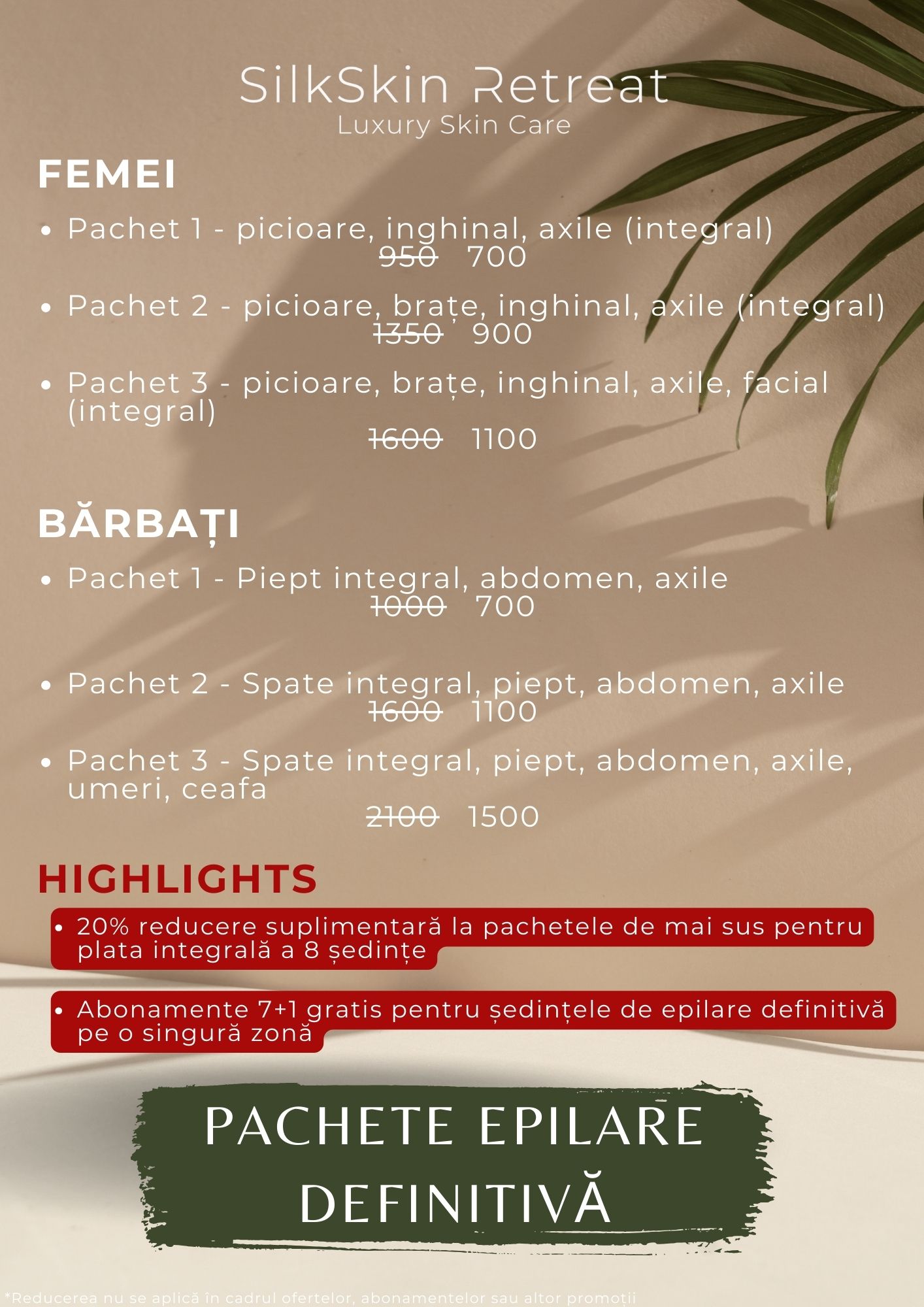 Am avut o experiență extraordinară la salonul SilkSkin Retreat pentru epilarea definitivă. Încă de la prima vizită, am fost întâmpinată de un personal extrem de prietenos și profesionist. Atmosfera din salon este relaxantă ceea ce contribuie la o experiență plăcută. Salonul este foarte curat și bine echipat, ceea ce mi-a oferit încredere și confort pe parcursul ședinței. Procedura în sine a fost mult mai puțin dureroasă decât mă așteptam, datorită echipamentului de ultimă generație pe care îl folosesc. Recomand cu căldură pentru oricine caută servicii de epilare definitivă de înaltă calitate!